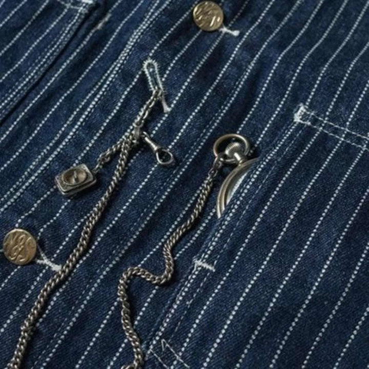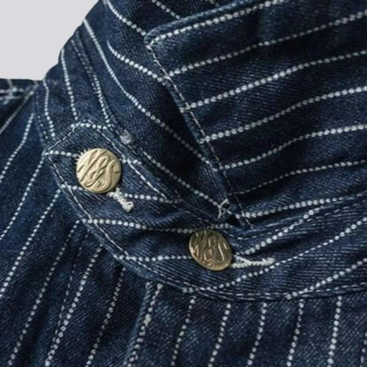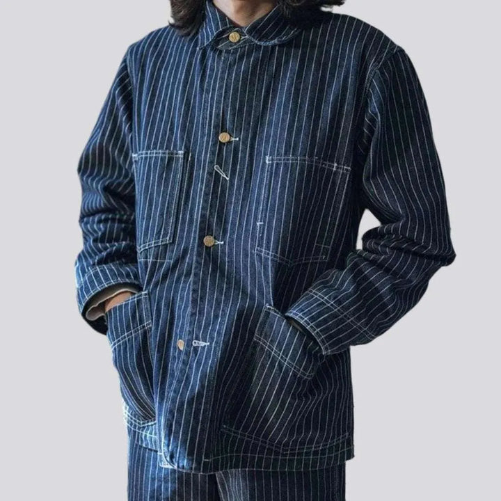 Introducing our 2023 Autumn-Winter Collection's edgy 12oz jean jacket for men a stylish combination of conventional and trendy style! With its midweight fabric, vertical stripes, medium wash and high-quality construction, this jacket is guaranteed to take your street flair to the next level.